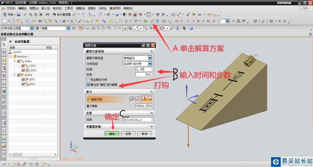 7、這個平面副用不到驅動,我們把連桿和運動副指派設置好,進行解算就可以了,單擊解算方案--時間輸入1.35 --步數為500--并在單擊確定進行解算打上勾--單擊確定進行求解,(待求解百分百)