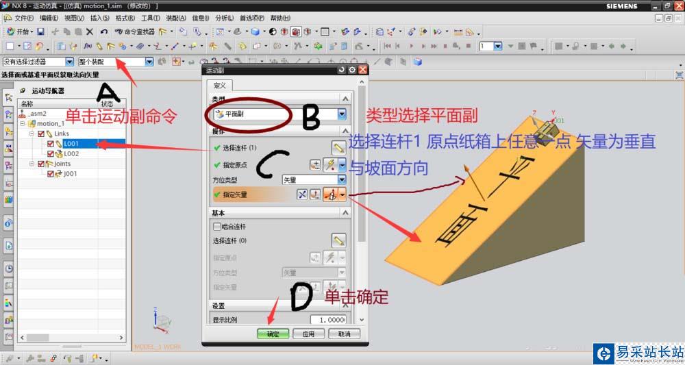 想要制作一個紙箱子在坡面移動的動畫效果,需要使用UG平面副來實現,下面我們就來看看詳細的教程。