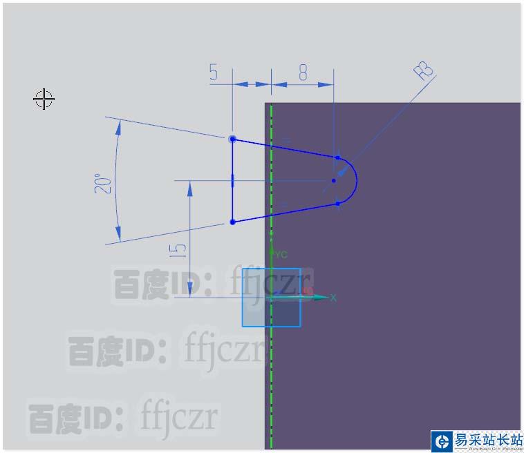 5、用標注對上步繪的輪廓進行約束定位,輪廓線圓弧的半徑為3,兩條相等長度的切線形成的角度為20度,圓心到X軸的距離為15,到Y軸的距離為8;與Y軸平行的豎線距離Y軸5cm. 草圖完全約束,完成草繪。