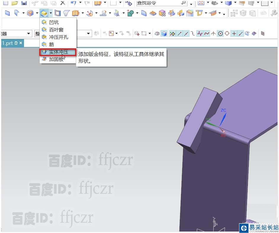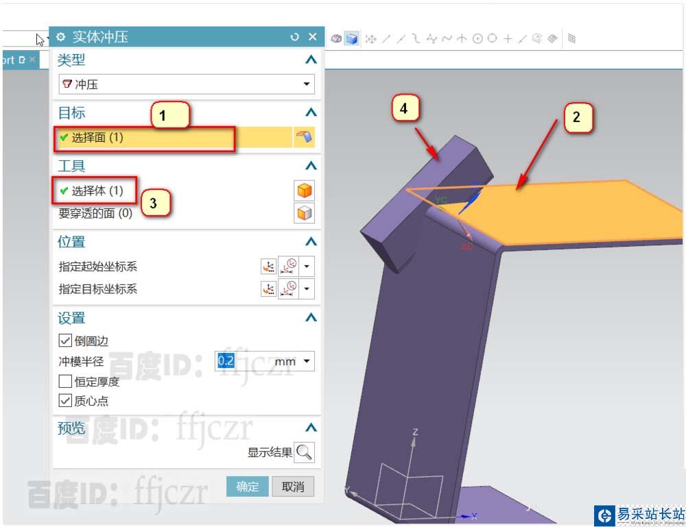 7、選用實體沖壓,對話框中的目標面為折彎件上的外表面,工具體為上步創建的實體;沖壓半徑為0.2,確定后得到折件中的一個加強筋。