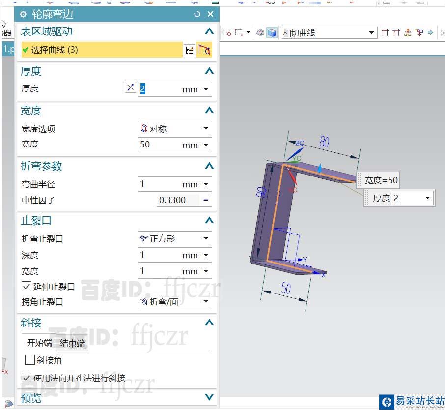 成草繪后,在輪廓彎邊對話框中設置折件的厚度為2,寬度選項為對稱,寬度為50;確定后得到一個折彎件。