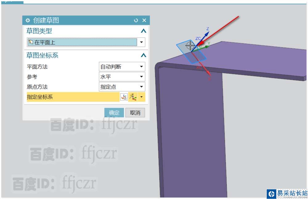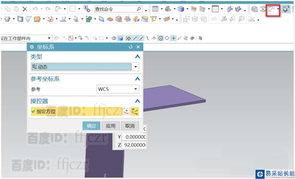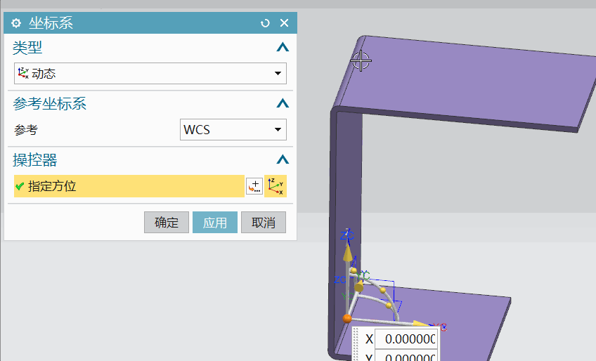 3、選用WCS定向,類型為動態。在折彎件的上直角邊中點處新建一個45度傾斜的坐標。