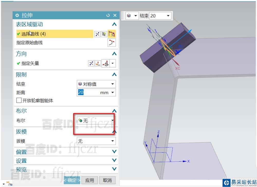 6、完成草繪后,回到拉伸對話框,類型為對稱,值為20;不要選用布爾運算。得到沖壓用的工具體。