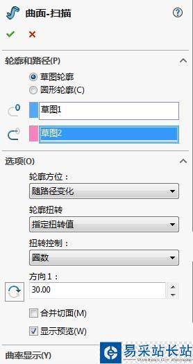 4、啟用掃描曲面命令,旋轉第一個草圖為掃描輪廓,第二個草圖為掃描路徑