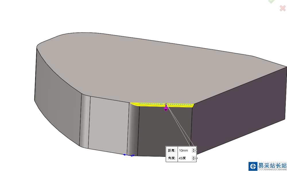 6、軟件里倒角可以選擇度數(shù),也可以選擇距離,如果遇到不好倒角的邊線,可以利用拉伸切除進(jìn)行倒角。
