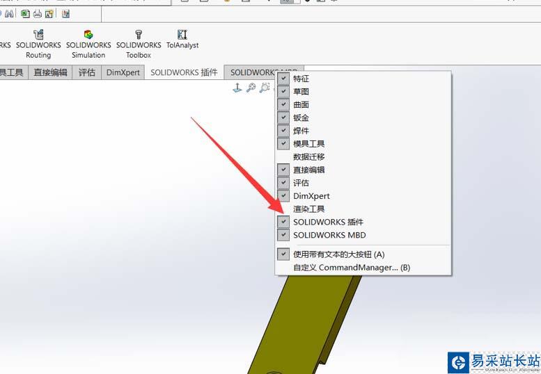 1、我們先調出渲染工具,右擊Solidworks的快捷欄,右擊找到渲染工具。