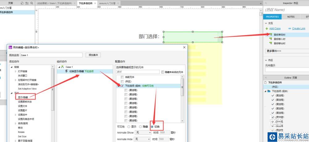 5、對熱區(qū)設(shè)置交互如下:新增用例“鼠標(biāo)單擊時”,設(shè)置組合“下拉選項”的“可見性”為“切換”;這個用例的意思就是,鼠標(biāo)點擊一次時,如果組合為隱藏,則點擊后為可見;如果組合為可見,則點擊后隱藏。