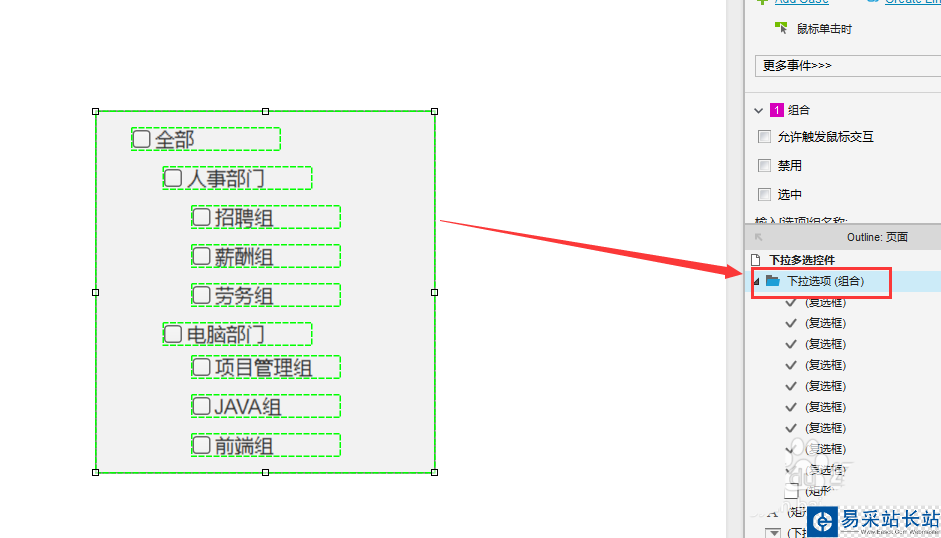 3、把灰底box和復(fù)選框排列在一起,全選做成一個組合,命名為“下拉選項”;把組合“下拉選項”和“部門選擇”下拉列表框排列在一起;拖入一個熱區(qū),放在下拉列表框上方;