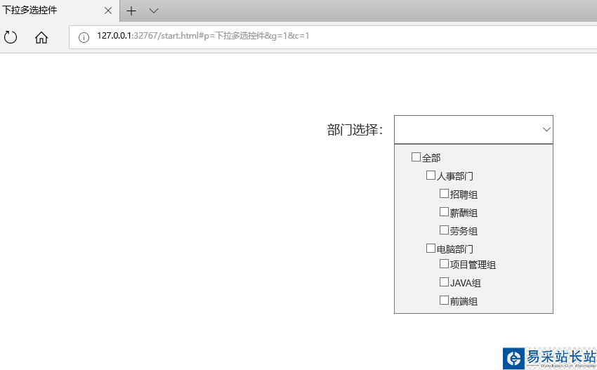 6、點擊F5運行axure,可在瀏覽器上看見交互效果,點擊下拉框后,顯示部門多選列表,可多選部門。