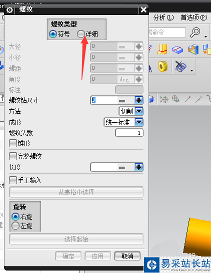 6、彈出的對話框中選擇詳細,不然做出的螺紋看不見