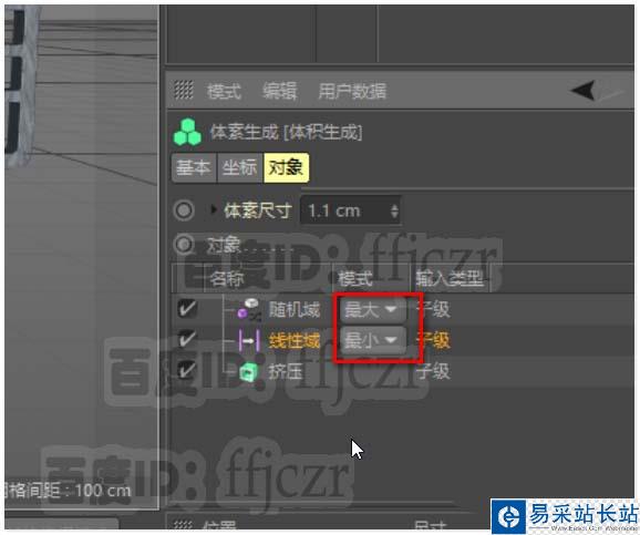 8、在體積生成口器的對象欄中,將隨機域調到最上層,接著是線性域;隨機域的模式為最大,線性域的模式為最小;這樣通過線性域的移動即可控制文字生成腐蝕效果。
