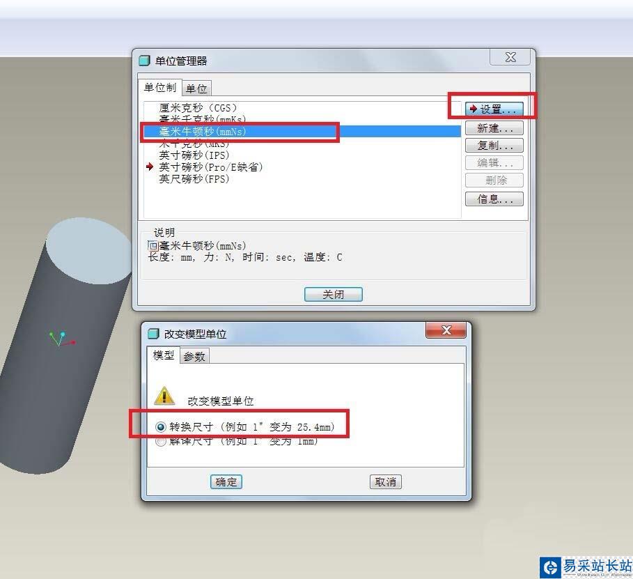 7、選擇--毫米牛頓秒MMNS--設(shè)置---。這時會彈出一個對話框,為了說明效果,我們選 上--轉(zhuǎn)換尺寸--確定試一下,再關(guān)閉上一層對話框