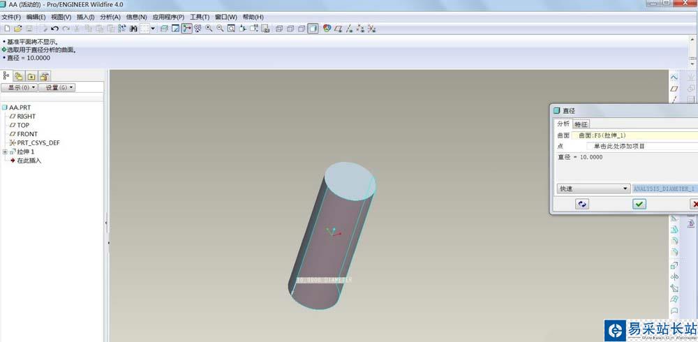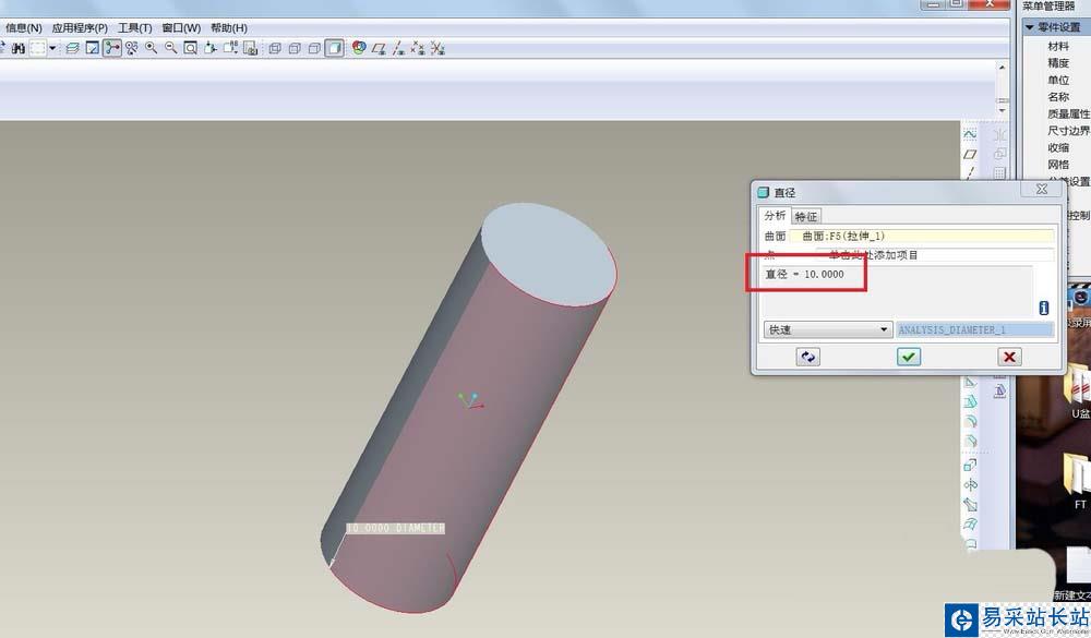 3、點一下圓柱的圓弧部分,可以看到,現(xiàn)在的直徑是10