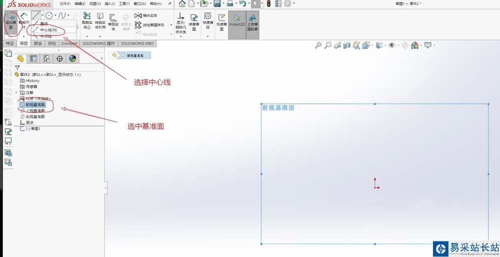 1、打開(kāi)【SOLID WORKS】創(chuàng)建3D界面,選中一個(gè)基準(zhǔn)面,選擇草圖 - 直線下拉 - 中心線;以原坐標(biāo)點(diǎn)為中心點(diǎn),畫一條水平的直線