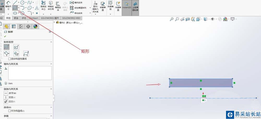 2、用【矩形】在中心點(diǎn)一邊畫一個(gè)矩形,如圖;
