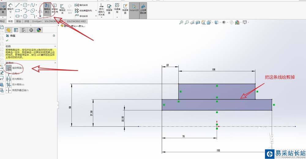 5、把多余的線段刪除,選擇【剪裁實(shí)體】 - 強(qiáng)勁剪裁;如圖