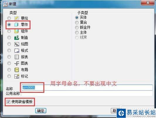 2、選擇零件,用字母或者數字對文件命名,勾選缺省模式