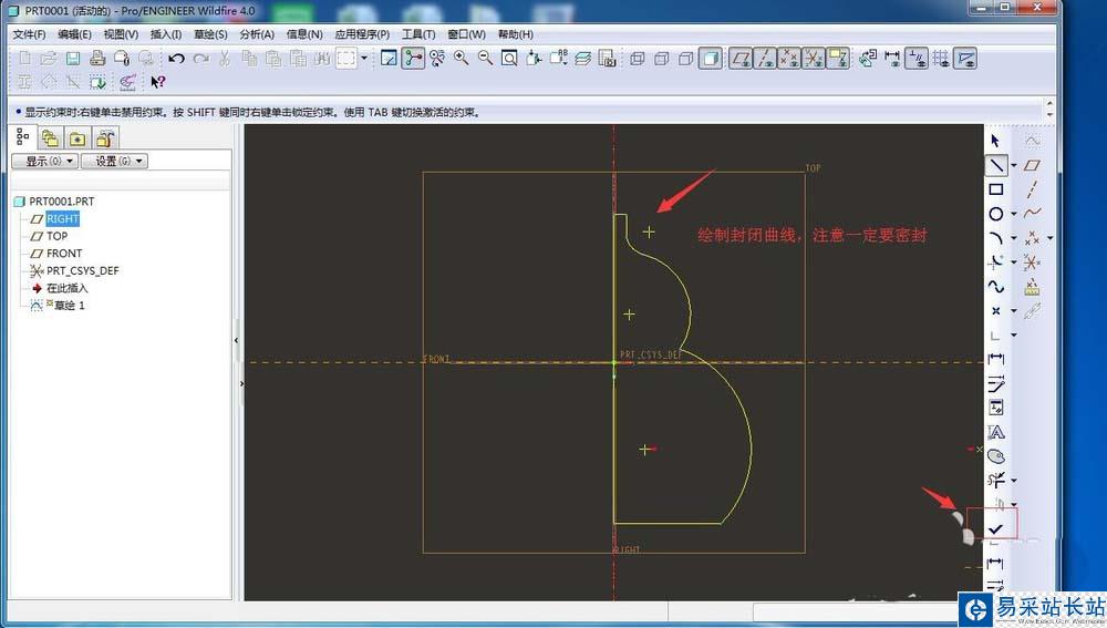 6、在中心線的一側繪制封閉曲線,繪制完之后在右下角點擊√