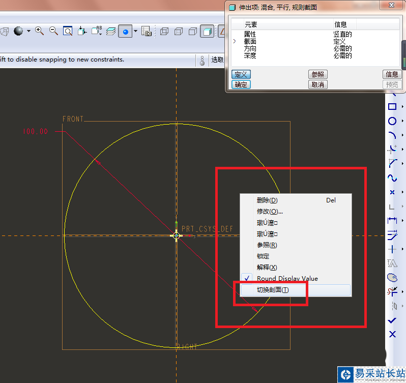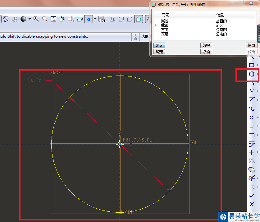 7、如下圖所示,進入到草繪界面,點擊右邊工具欄中的“圓”,以坐標原點為圓心畫一個直徑100的圓。