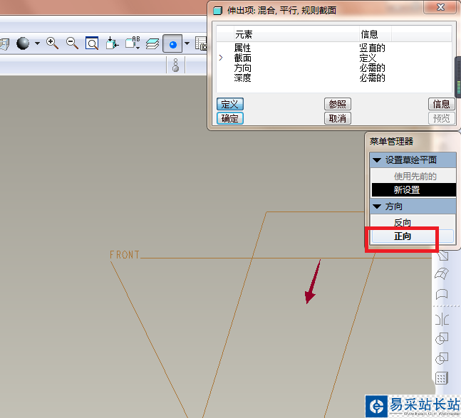 4、如下圖所示,根據菜單管理器中的要求,選擇“FRONT”基準面。