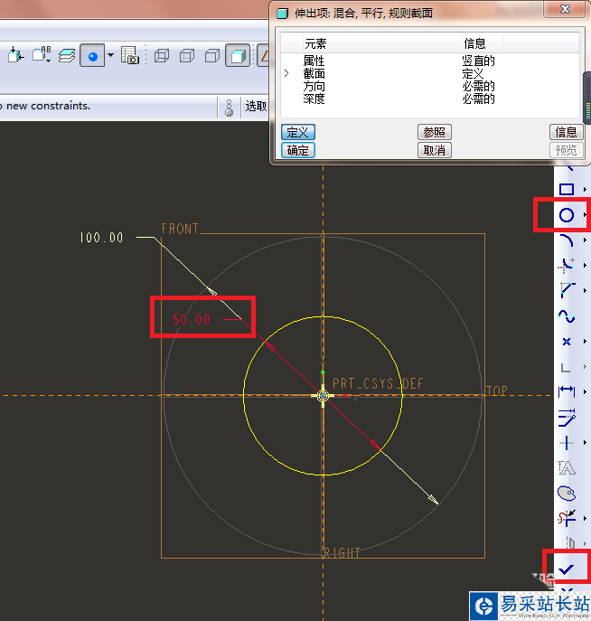 9、如下圖所示,重復第7步,以坐標原點為圓心畫一個直徑50的圓,然后點擊右邊工具欄中的√,完成并退出草繪。