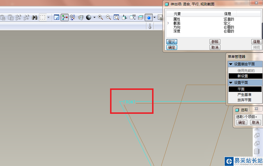 3、如下圖所示,一個“伸出項”的對話框出現了,菜單管理器中的屬性默認是“直的”,所以點擊“完成”。