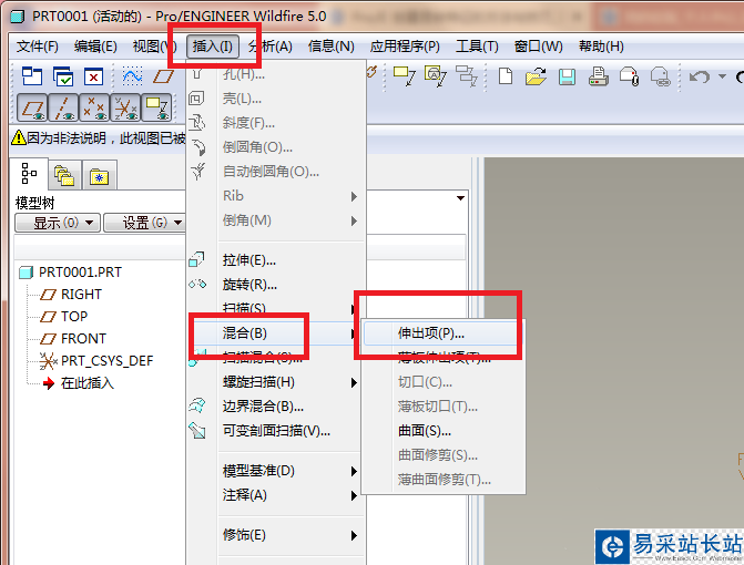 1、如下圖所示,打開Pro/e5.0軟件,新建一個實體零件,使軟件進入到三維建模狀態,然后執行下圖中的操作:【插入——混合——伸出項】。