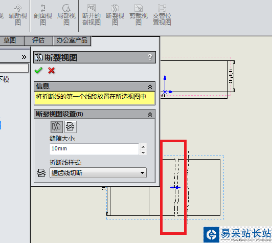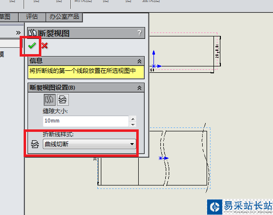 7、如下圖所示,將折斷線樣式改成“曲線切斷”,然后,點(diǎn)擊對話框左上角的√,完成斷裂視圖的創(chuàng)建。
