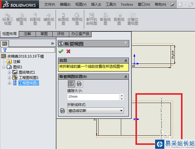 3、如下圖所示,出現(xiàn)“斷裂視圖”對話框,可以看到信息提示:選擇要斷開的工程圖視圖。