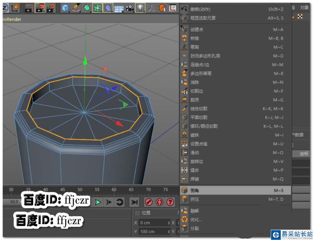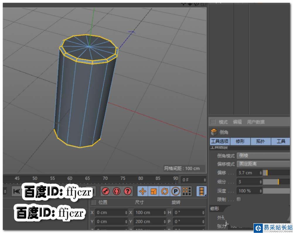 5、在邊模式下選中圓柱上端面向下擠壓后得到的邊線;選用倒角命令,對選中的兩條邊進行倒圓角,偏移值為3.5,細分為3.