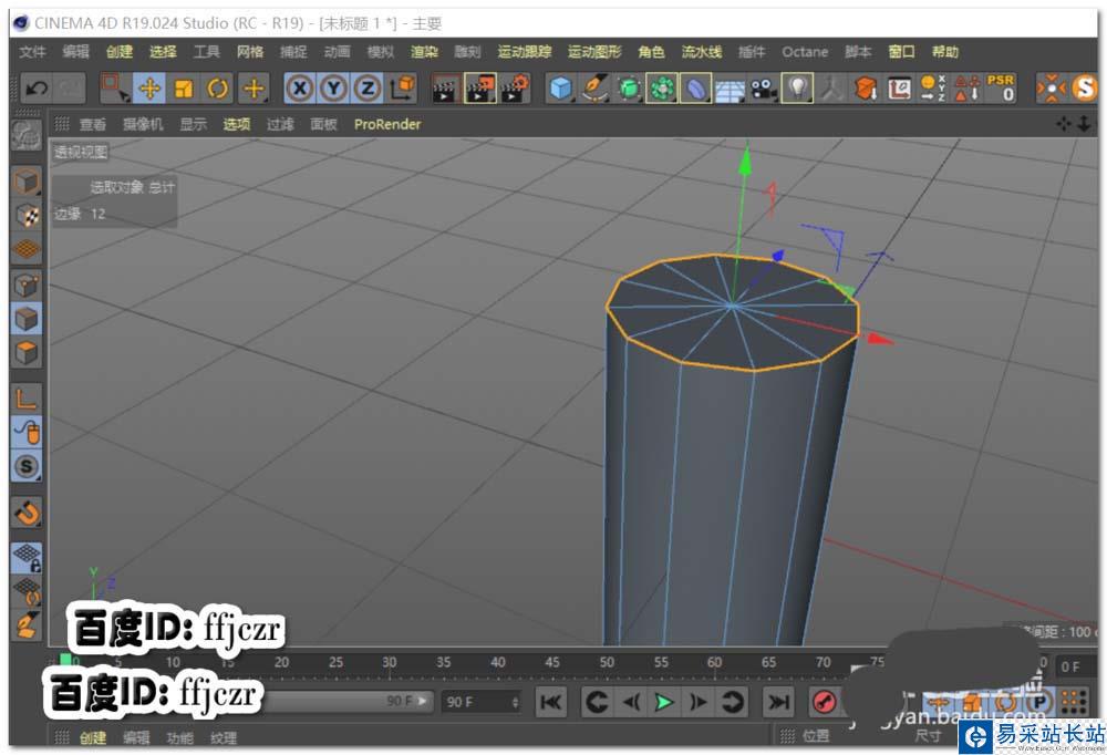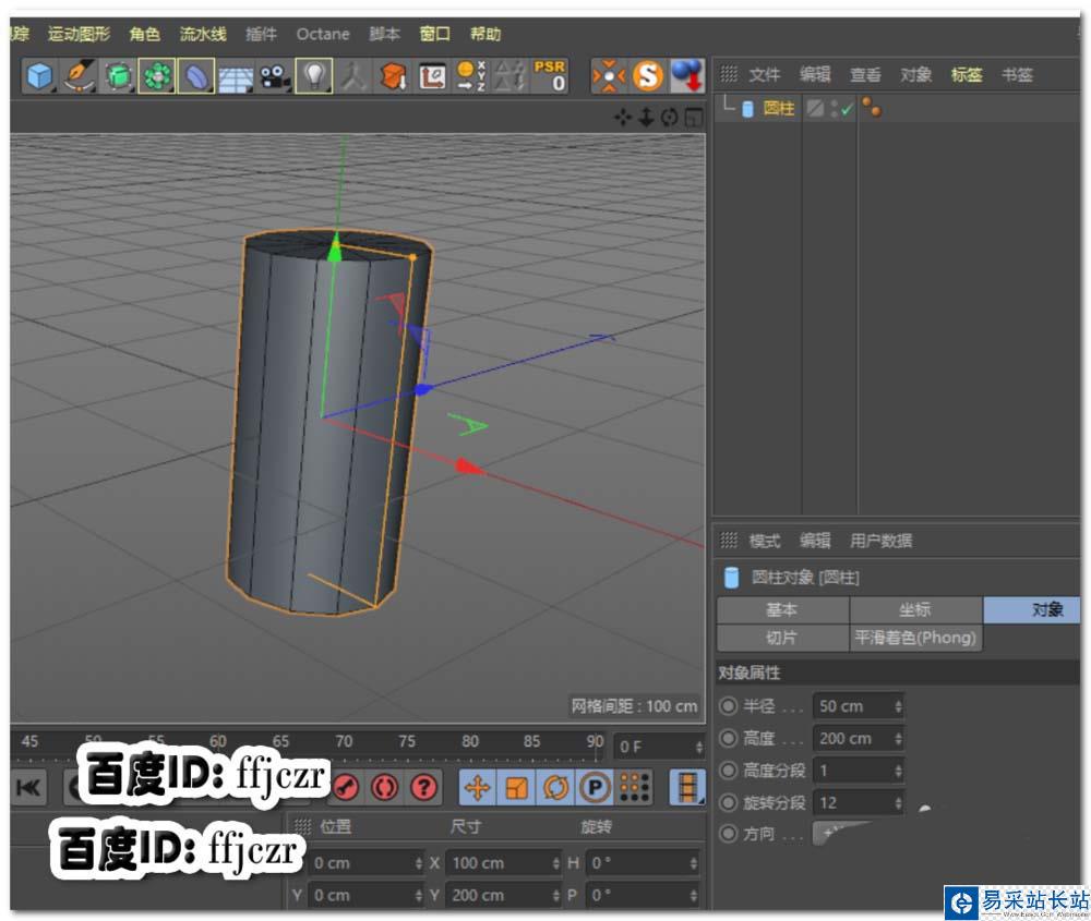 1、新建文件,在工作區中創建圓柱,半徑為50,高度為200,高度分段為1,旋轉分段為12,方向為+Y。