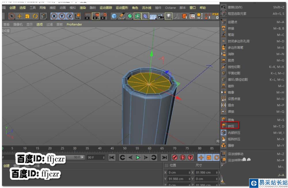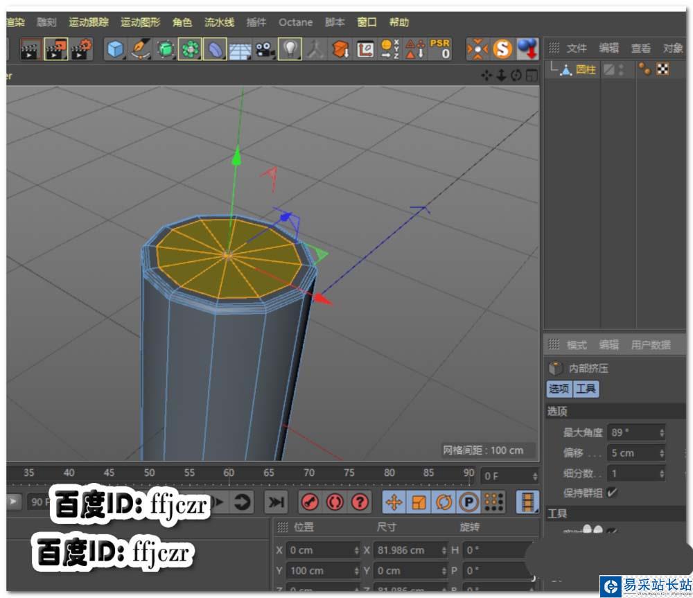 3、在面模式下,選中圓柱體上端面(如圖所示),選用內部擠壓命令,偏移值為5。