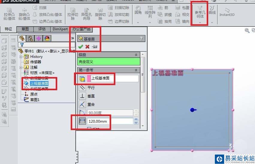 4、如下圖所示,首先點擊工具欄中的“參考幾何體”下方的三角圖標,然后在其展開的下拉菜單中點擊“基準面”,在彈出“基準面”對話框之后,點擊設計樹中的“上視基準面”作為第一參考,設置距離為120,然后打√。