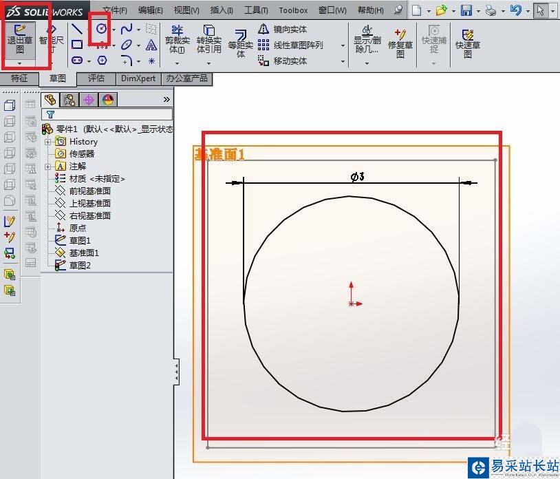 5、如下圖所示,首先選中剛剛新建的基準面,然后在工具欄中點擊“草圖繪制”就直接進入到草圖狀態,然后點擊工具欄中的“圓”圖標,然后以坐標原點為圓心畫一個圓,然后點擊工具欄中的“智能尺寸”標注圓的直徑3,然后“退出草圖”。