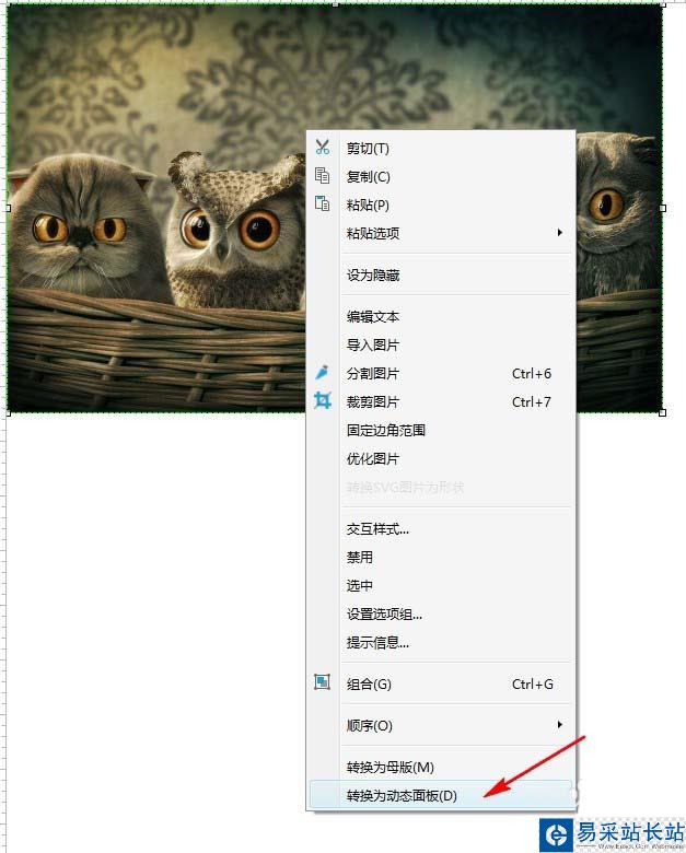 2、點中此”圖片:pic“,鼠標右鍵,選擇“轉(zhuǎn)換為動態(tài)面板”