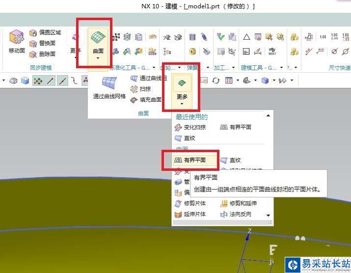 8、如下圖所示,首先點(diǎn)擊工具欄中的“曲面”下方的三角形,然后點(diǎn)擊展開的下拉菜單中的“更多”下方的三角形,在最后一層的展開下拉菜單中點(diǎn)擊“有界平面”。