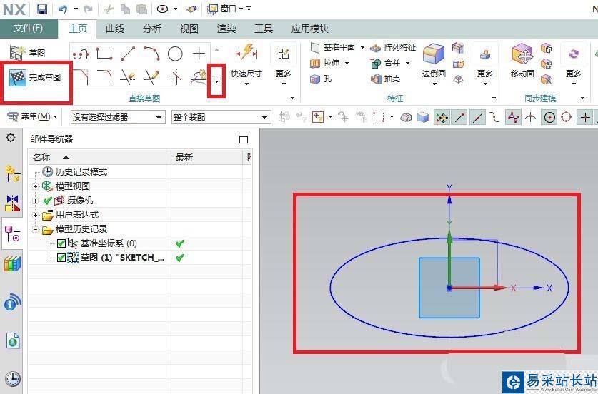 3、如下圖示,首先點(diǎn)擊工具欄中“直接草圖”框右邊的三角形,在出現(xiàn)的眾多草圖工具選擇“橢圓”,然后以坐標(biāo)原點(diǎn)為圓心畫一個(gè)橢圓,尺寸自己看著辦,最后“完成草圖”即可。