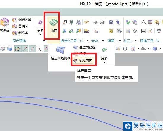6、如下圖所示,首先點(diǎn)擊工具欄中的“曲面”下方的三角形,然后在下拉菜單中點(diǎn)擊“填充曲面”。