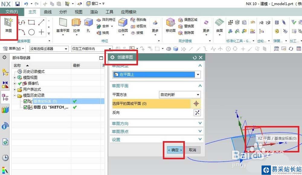 2、如下圖所示,點(diǎn)擊工具欄中的“草圖”圖標(biāo),在出現(xiàn)“創(chuàng)建草圖”對(duì)話框之后,在基準(zhǔn)坐標(biāo)系中選擇“XY平面”為草圖平面,最后“確定”就行了。