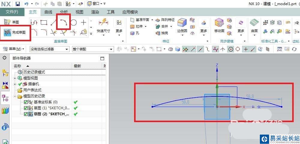 5、如下圖所示,首先點(diǎn)擊工具欄中的“圓弧”圖標(biāo),在草圖中畫一個(gè)圓弧(見下圖效果),“完成草圖”。