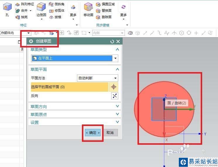 2、如下圖所示,點擊工具欄中的“草圖”,隨之出現一個“創建草圖”對話框,然后在基準面坐標系中選擇“YZ平面”為草圖平面,最后點擊“確定”。