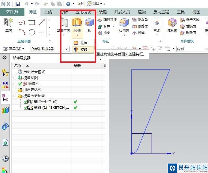 5、如下圖所示,出現“旋轉”對話框,選擇曲線為剛剛畫的草圖,軸選擇那條豎直的線段,最后“確定”完成旋轉操作。