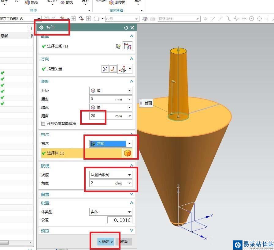9、如下圖所示,出現“拉伸”對話框,截面選擇曲線為剛剛畫的草圖圓,距離看著給了20,布爾求和不能少,拔模從起始限制,角度2度。