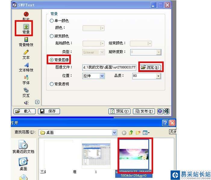 2、點擊背景——選擇背景圖片——點擊瀏覽,選擇一張中秋的背景圖——然后點擊打開,也可以設置圖片的位置:拉伸或平鋪,