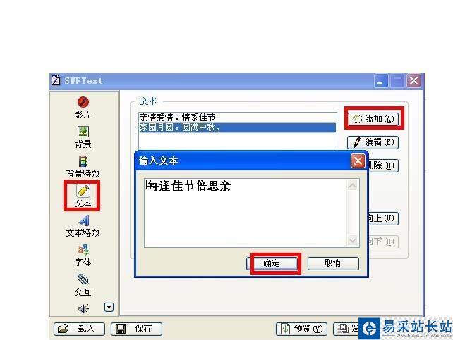 4、添加中秋賀詞:點擊文本——點擊添加——在文本編輯中輸入中秋賀詞,然后點擊確定。最好把一段祝福語分成幾段賀詞來添加。