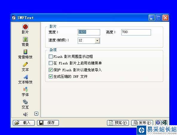 1、首先下載安裝一個SWFTEXT軟件,然后打開軟件——點擊影片,設置影片大小,我的背景圖是1920X700,所以就設置了同背景圖一樣的大小。