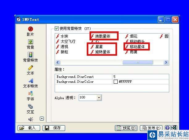 3、設置星星的背景特效:點擊背景特效——拉動滑塊差不多到最后——這時就會看到有幾種星體可以選擇:消散星體、星星、旋轉星體、移動星體。點擊選擇自己喜歡的一種就可以了。