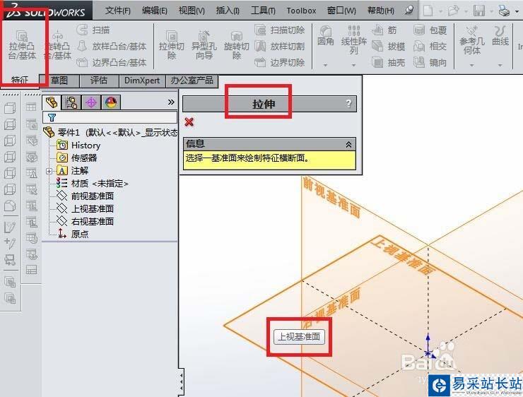 2、如下圖所示,首先點擊工具欄中的“拉伸凸臺/基體”命令,然后彈出一個“拉伸”對話框和三個基準面,然后筆者選擇“上視基準面”為草圖平面。