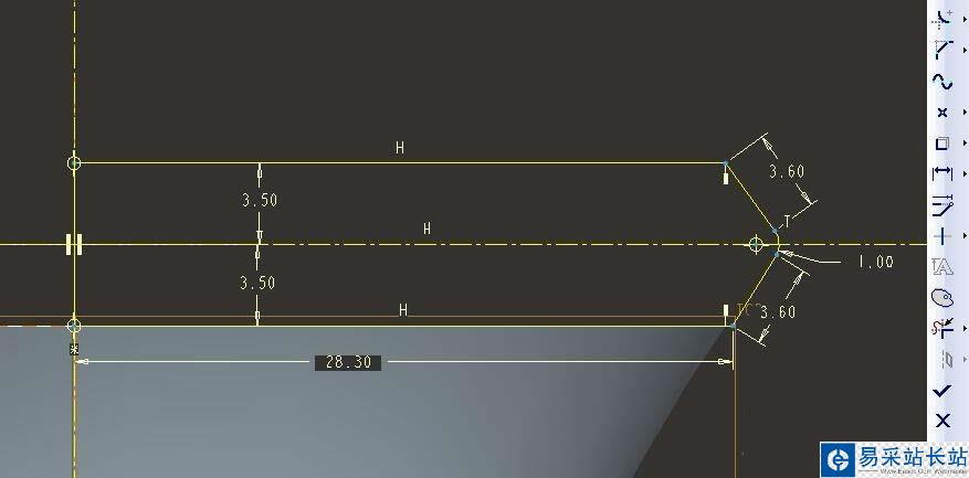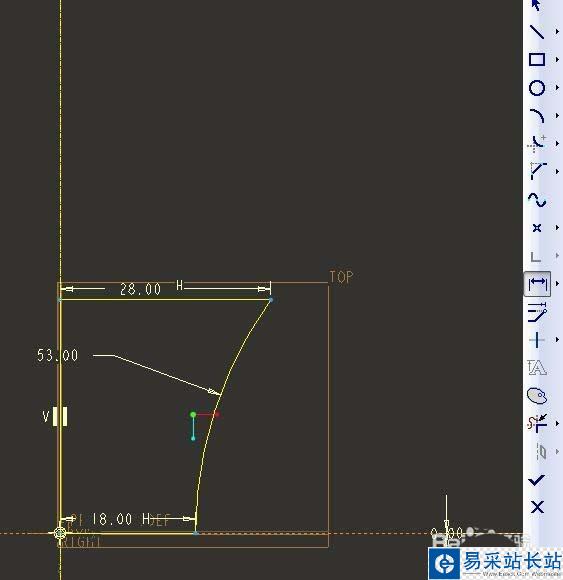 3、如下圖所示,進入到草繪環境,首先點擊“中心線”圖標,在草繪區域過坐標原點畫一條縱向的中心線,然后點擊“直線”圖標,在草繪區域畫三條直線段(兩橫一豎,見下圖),然后點擊“圓弧”圖標,在草繪區域畫一條圓弧線段,然后點擊“標注”圖標,照著下圖標注尺寸,最終點擊√,完成并退出草繪。