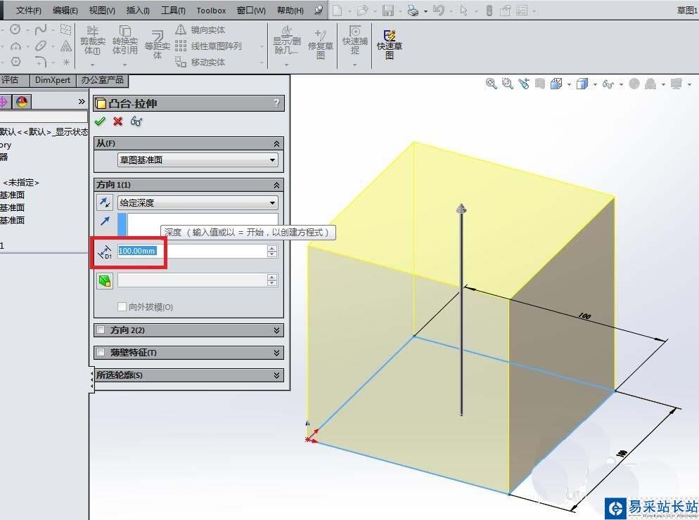 4、如下圖所示,退出草圖之后,就來到“凸臺-拉伸“對話框,設置拉伸高度為100,最后點擊對話框左上角的√,這樣一來,木托盤中間的正方體木塊就造好了一個。